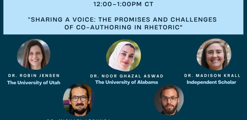 Looking forward to this event! See information below: December’s First Friday Forum will explore how scholars collaborate to produce co-authored work in rhetoric, highlighting both the generative possibilities and the complexities of writing together. Join Dr. Robin Jensen (University of Utah), Dr. Madison Krall (Independent Scholar), Dr. Noor Ghazal Aswad (University of Alabama), Dr. Michael…